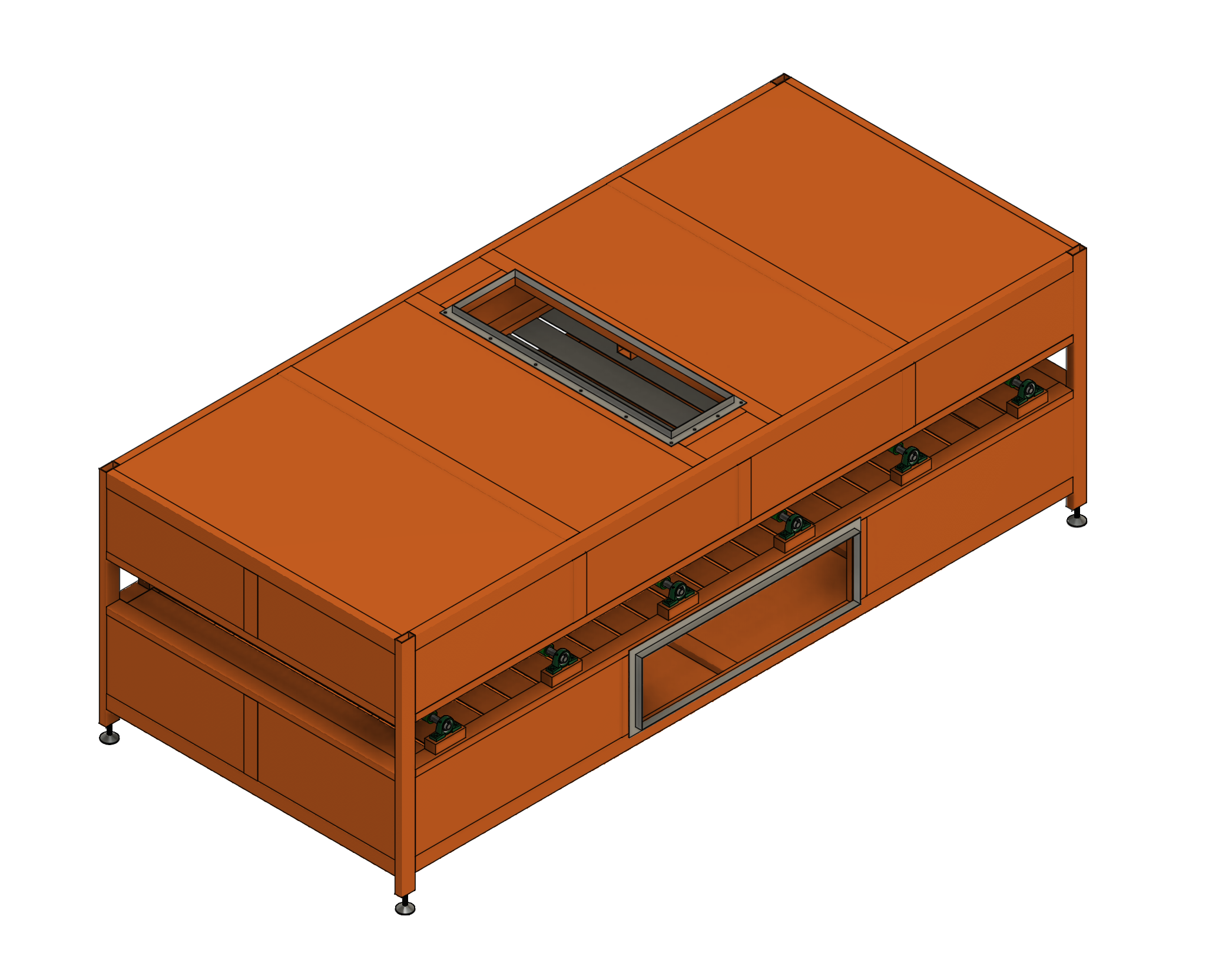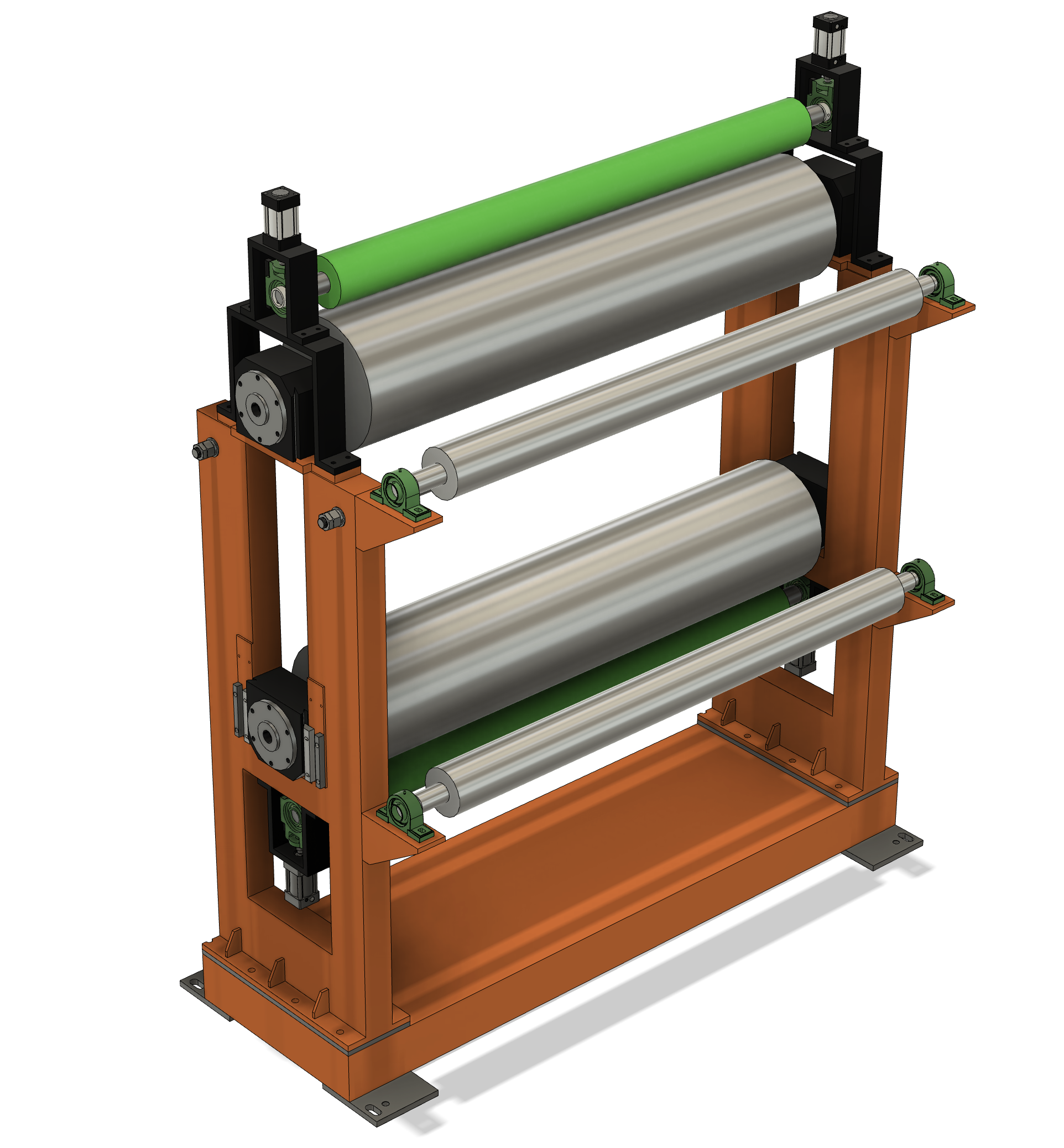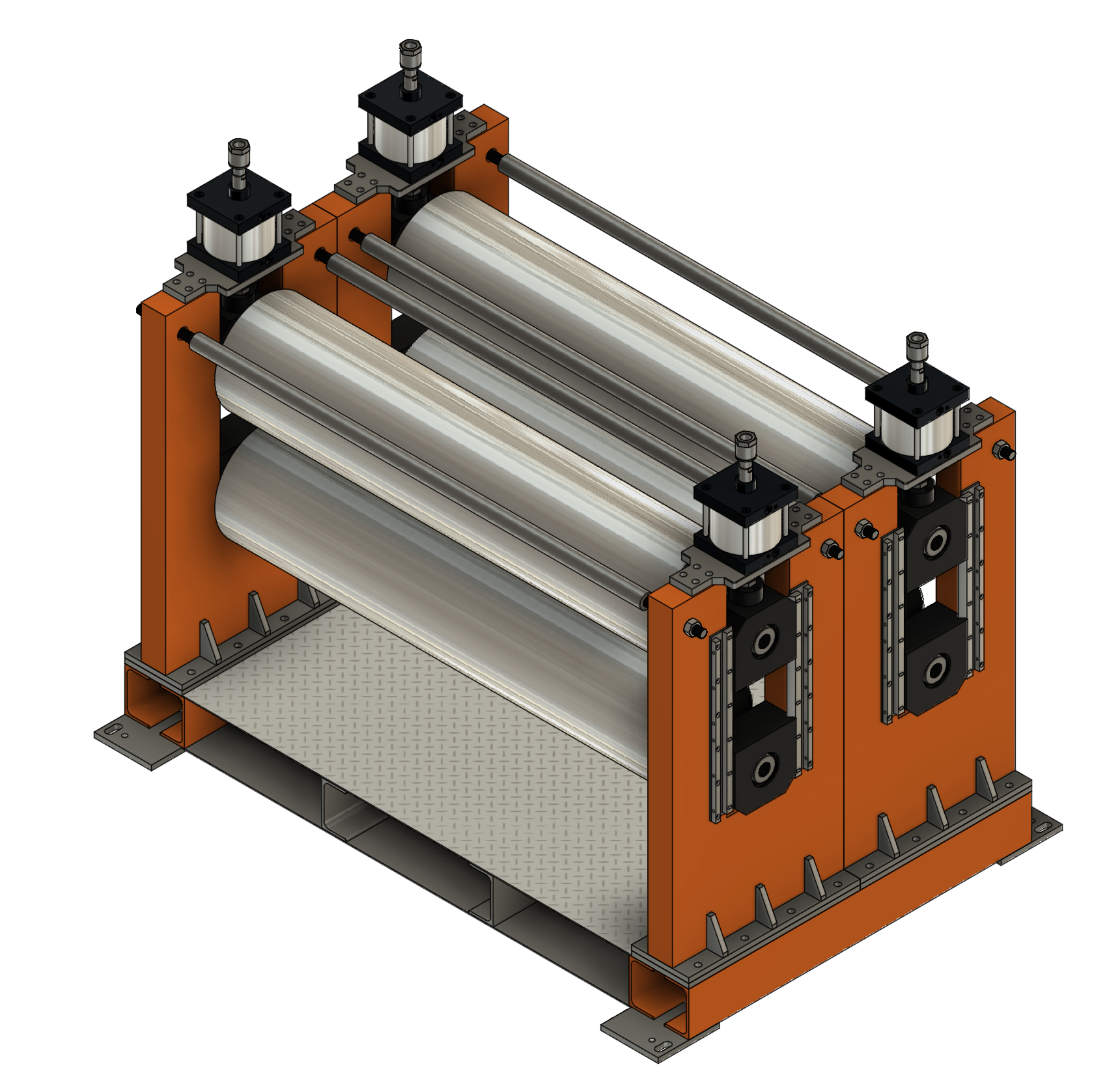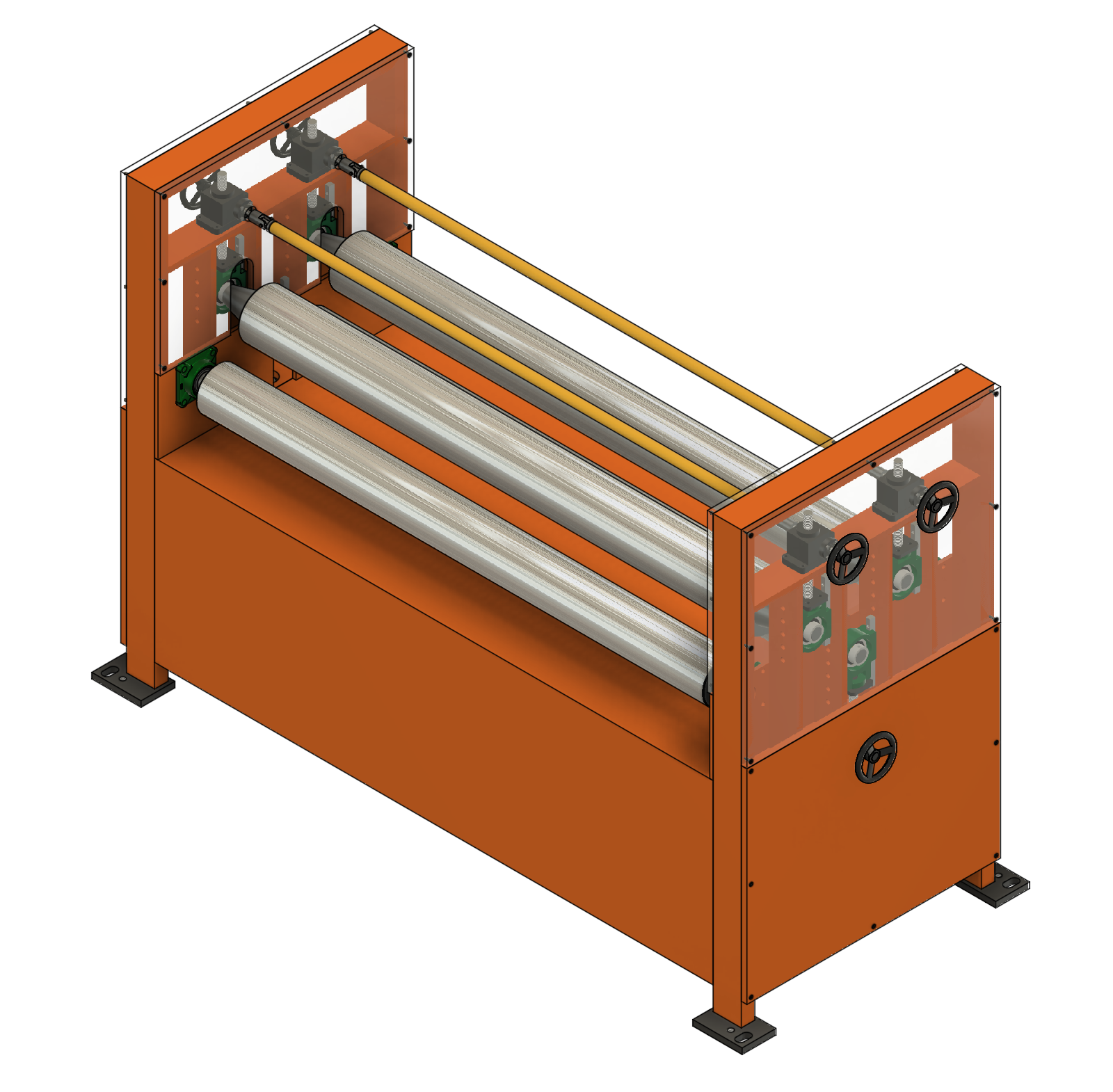 Use 2 pcs of Ф160MM mirror rollers as fixed roller, meanwhile use 3 pcs of Ф160MM mirror rollers as adjustable roller, can adjust vertically. The function of it is to make the ACP even.We may take 20MM thick Acrylic panel, so that workers can view the position of adjustable rollers. The traditional way is covered by a 4MM steel panel, workers often run into trouble somehow when they are not able to see the position.